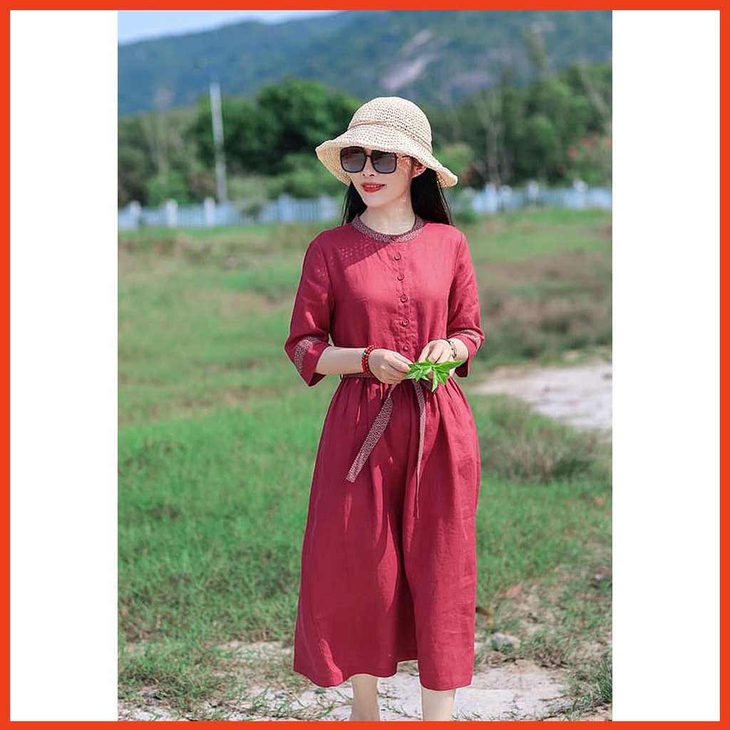 Đầm Suông Thắt Eo Cổ Viền Hoa Chi Tiết Trung Niên Linen free ship